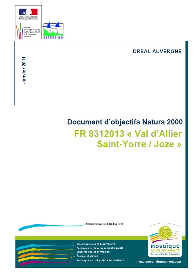 Le document d’objectifs (DOCOB) du site "Val d’Allier St-Yorre - Joze" a été réalisé par le bureau d’études Mosaïque environnement et validé par le comité de pilotage en septembre 2010.